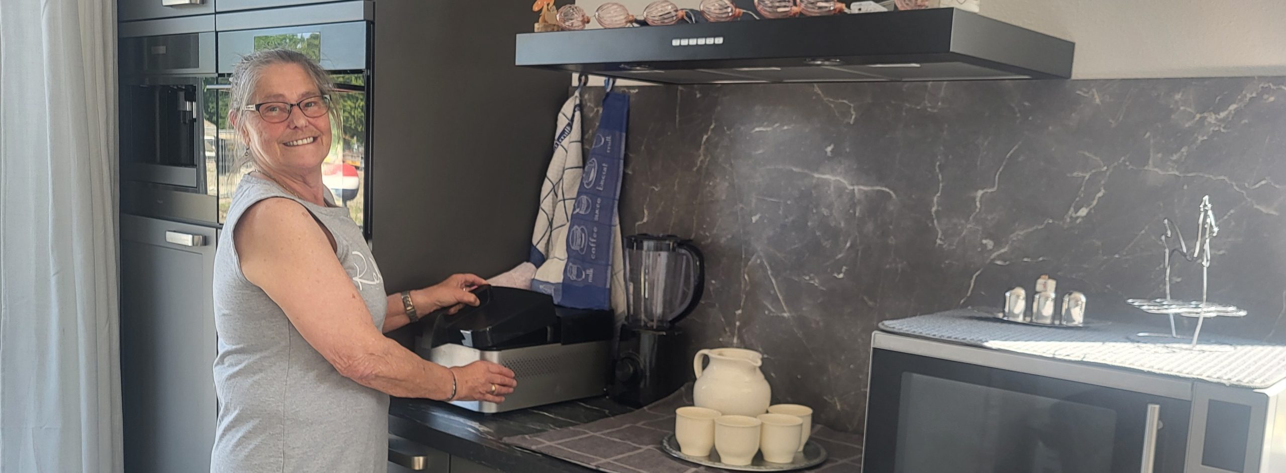 Hoewel de woning gloednieuw is, houdt Elly vast aan haar vertrouwde kookgewoonten. “Ik heb een inductiekookplaat, maar die heb ik nog nooit gebruikt. Ook de combi-oven zit bij wijze van spreken nog in het plastic. Ik kook niet voor mezelf. Meestal haal ik kant-en-klaarmaaltijden of gooi ik een schnitzel of loempia in airfryer.” Ze lacht: “Ooit ga ik me verdiepen in hoe die moderne apparaten werken. Maar voorlopig red ik me prima zo.”