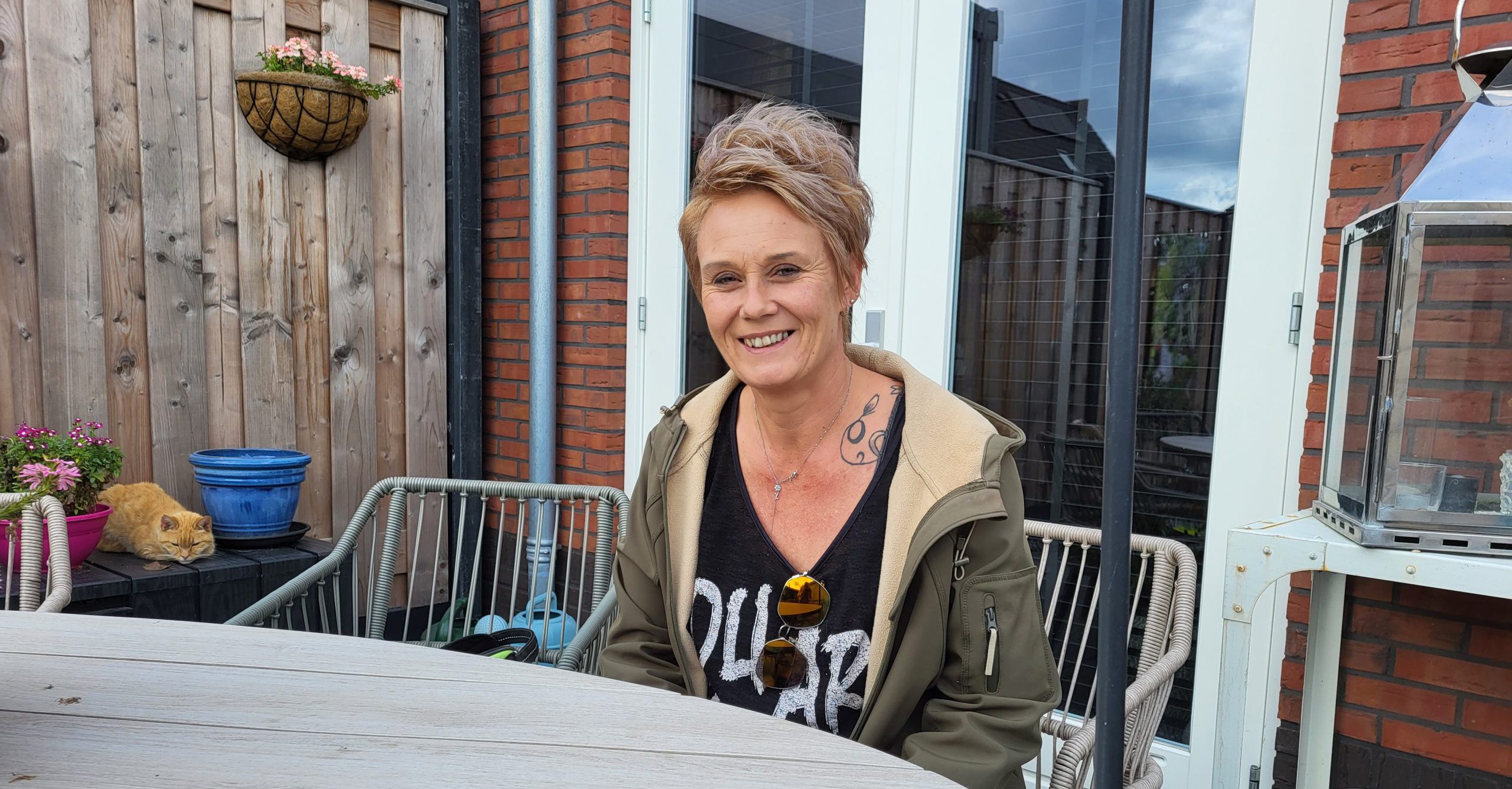 ‘Het is een fijn huis. We hebben de boel buiten nu gelukkig ook klaar.’ De tuin is bestraat, er is een grote vijver aangelegd waar koi karpers in zwemmen en er achter in de tuin heeft man Gerbrand een gigantische overkapping gebouwd. Eén gedeelte daarvan is afsluitbaar. ‘Daarin gaan we een huisbar bouwen voor de jeugd. Die kunnen bijna nergens terecht nu alles zo duur is geworden. Straks kunnen onze jongens met hun vrienden daar mooi een beetje hangen en Formule 1 kijken.’